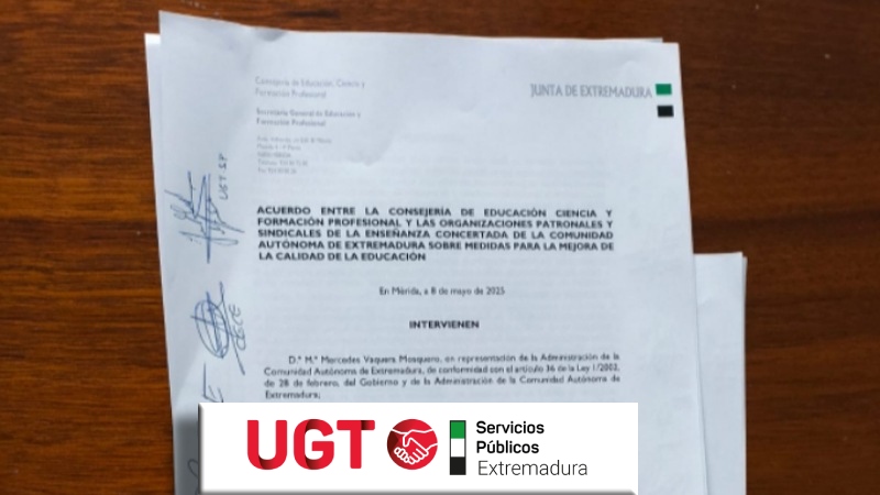 Se ha publicado en el Diario Oficial de Extremadura (DOE Nº 98, de 23 de mayo de 2025) la Resolución por la que se da publicidad al Acuerdo firmado el pasado 8 de mayo de 2025 entre la Consejería de Educación, Ciencia y Formación Profesional y las Organizaciones Patronales y Sindicales de la Enseñanza Concertada de Extremadura (entre las que se encuentra UGT).