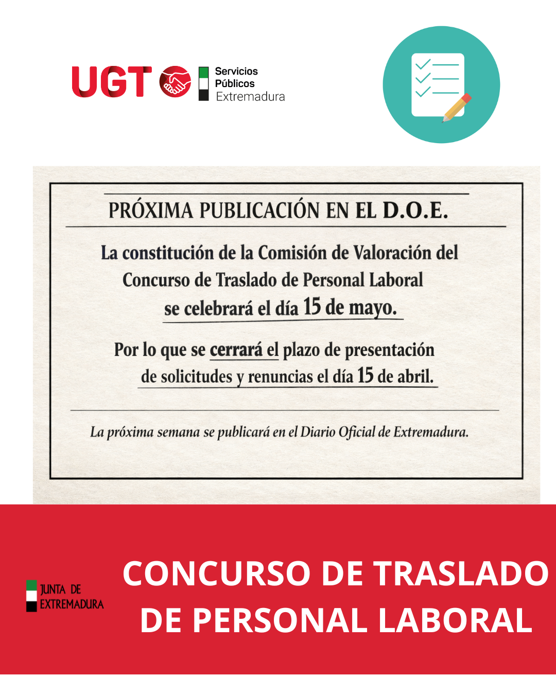 La constitución de la Comisión de Valoración tendrá lugar el próximo día 15 de mayo de 2026, fecha a partir de la cual se iniciarán los trabajos de valoración de los méritos alegados en tiempo y forma por el personal laboral fijo al servicio de la Junta de Extremadura, correspondientes a todas las categorías y especialidades incluidas en la convocatoria. Asimismo, la Comisión procederá a la propuesta de adjudicación de los puestos de trabajo en el marco de la primera resolución de dicha convocatoria.