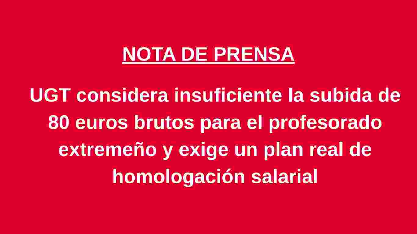UGT SP recuerda que, sin esta subida, el profesorado de Extremadura sería el peor pagado a nivel nacional e insiste en que esta mejora puntual no puede considerarse una solución estructural. Lo acordado y respaldado por todos los grupos políticos en la Asamblea de Extremadura, y reclamado de forma reiterada por UGT Servicios Públicos, es la puesta en marcha de un plan de homologación salarial que permita equiparar progresivamente los salarios del personal docente de Extremadura a la media nacional.