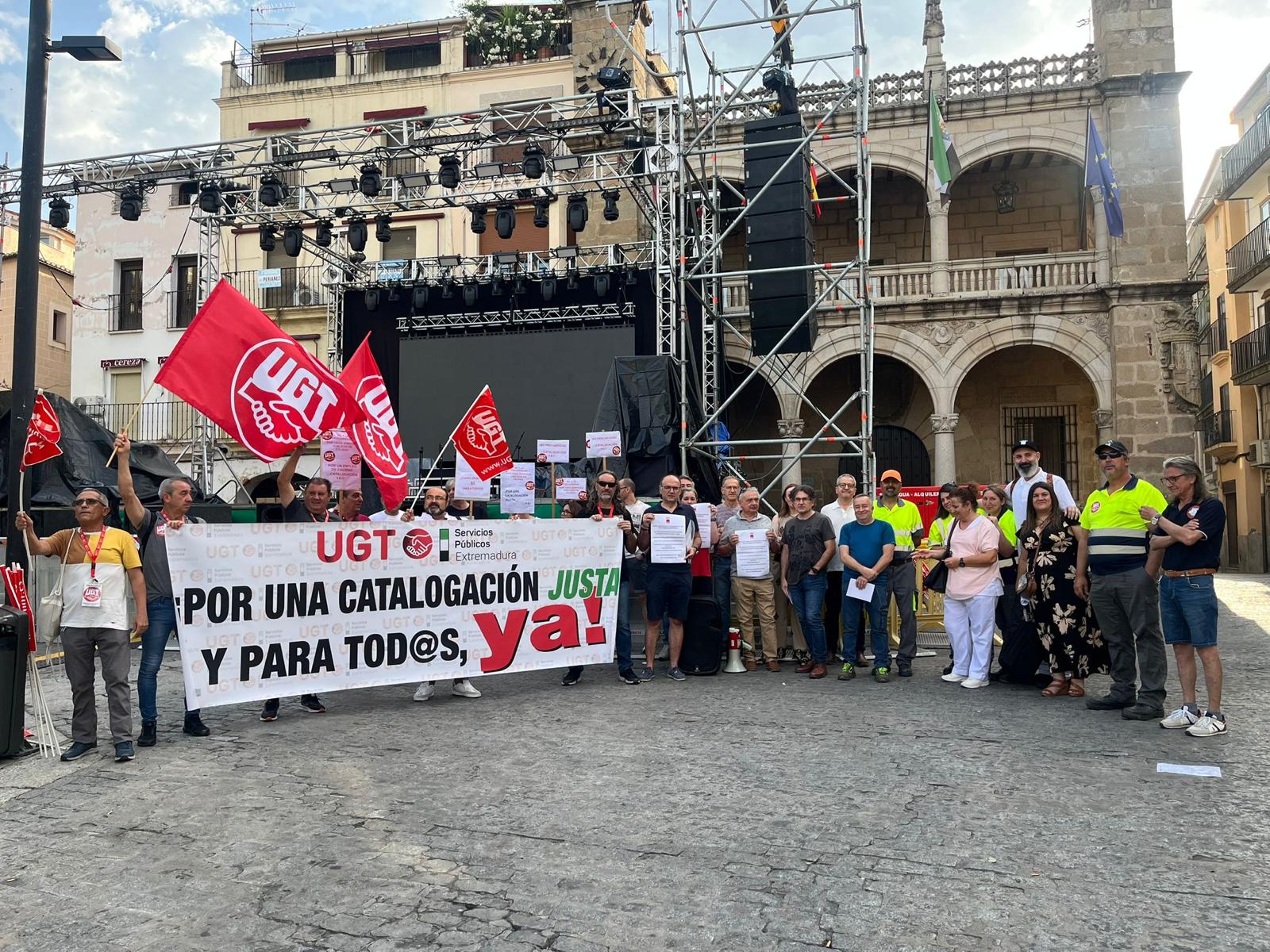 UGT Servicios Públicos Extremadura se ha concentrado hoy ante las puertas del Salón de Plenos del Ayuntamiento de Plasencia para denunciar públicamente el procedimiento irregular y discriminatorio seguido en la modificación del complemento específico del cuerpo de Policía Local, que excluye al resto del personal del Ayuntamiento.