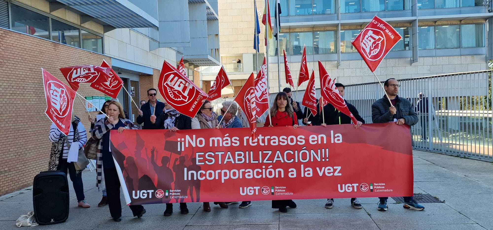 UGT Servicios Públicos Extremadura ha convocado hoy una concentración en el Edificio Morerías para exigir a la Consejera de Administraciones Públicas, Elena Manzano, que publique de una vez en el Diario Oficial de Extremadura (DOE) la fecha de incorporación del personal del proceso de estabilización y traslados, llevamos escuchando septiembre de 2024, diciembre de 2024, marzo de 2025, abril de 2025 y por último, mayo de 2025.